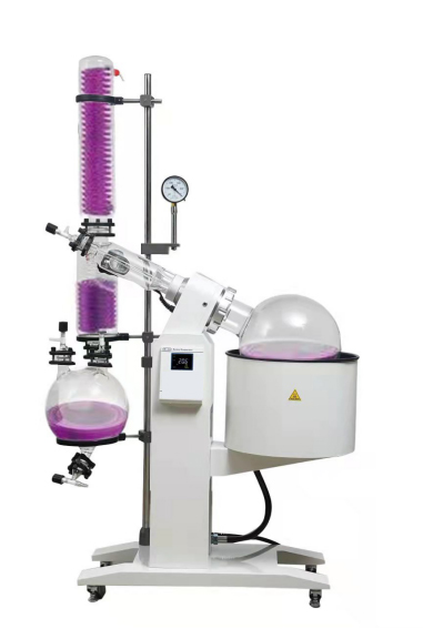 旋轉(zhuǎn)蒸發(fā)器是用無級調(diào)速使玻璃旋轉(zhuǎn)瓶恒速旋轉(zhuǎn),物料在瓶壁形成大面積均勻薄膜,再由智能恒溫水浴鍋對旋轉(zhuǎn)瓶進(jìn)行均勻加熱,在真空條件下高速蒸發(fā),溶媒蒸氣經(jīng)高效玻璃冷凝器冷卻,回收于收集瓶。