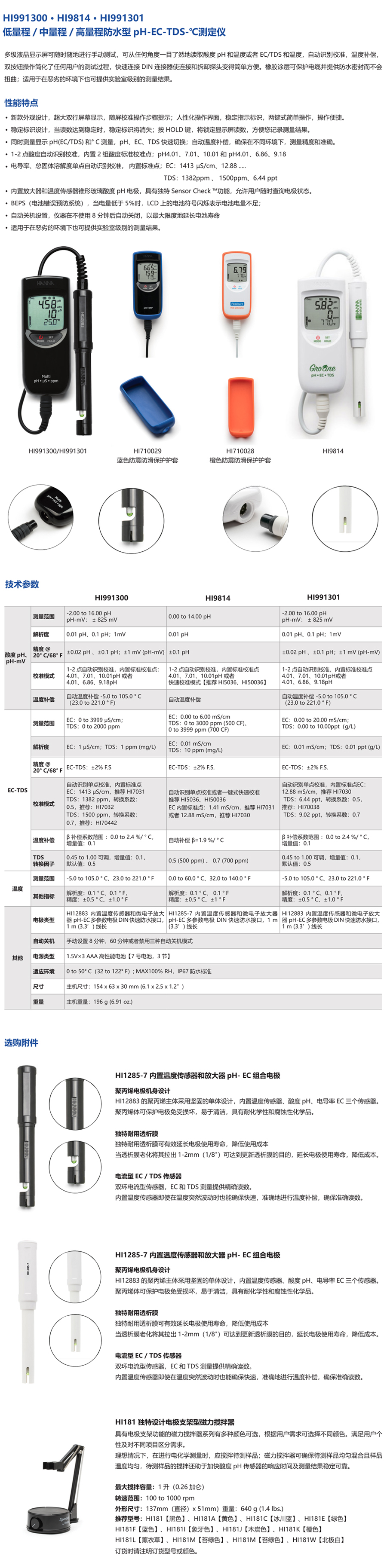 HI1285-7 內(nèi)置溫度傳感器和微電子放大器 pH-EC多參數(shù)電極 |
