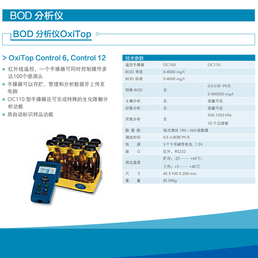 OxiTop Control 12,12個BOD測量單元,含OC100控制器,12個OxiTop-C測量頭,12個棕色510ml測量瓶及橡皮筒,12個攪拌棒及1個取棒桿,IS12攪拌器1個,100-240VAC適配器,CO2吸收劑50g,硝化抑制劑25ml,164/432ml溢流瓶各1,記錄紙1本,使用手冊