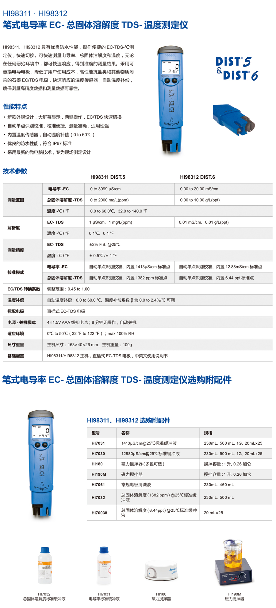 主機(jī),內(nèi)置電導(dǎo)率EC-總固體溶解度TDS直插式電極,電導(dǎo)率標(biāo)準(zhǔn)緩沖液套裝(標(biāo)準(zhǔn)值@25°C:12880 μS/cm 和定制專用電極清洗液,規(guī)格:20mL×2),中英文使用說明書,HI721014 專用攜帶盒