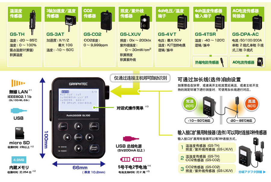 從溫濕度傳感器(GS-TH)·CO2傳感器(GS-CO2)·照度/紫外線傳感器(GS-LXUV)這3種內(nèi)選2種自由組合進(jìn)行測(cè)量的轉(zhuǎn)換器。