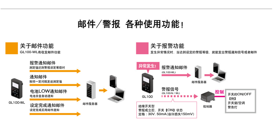 功能 數(shù)字顯示、波形顯示(僅限再生時(shí))、收錄開始/停止控制、采樣間隔変更、郵件送信控制功能、定制功能