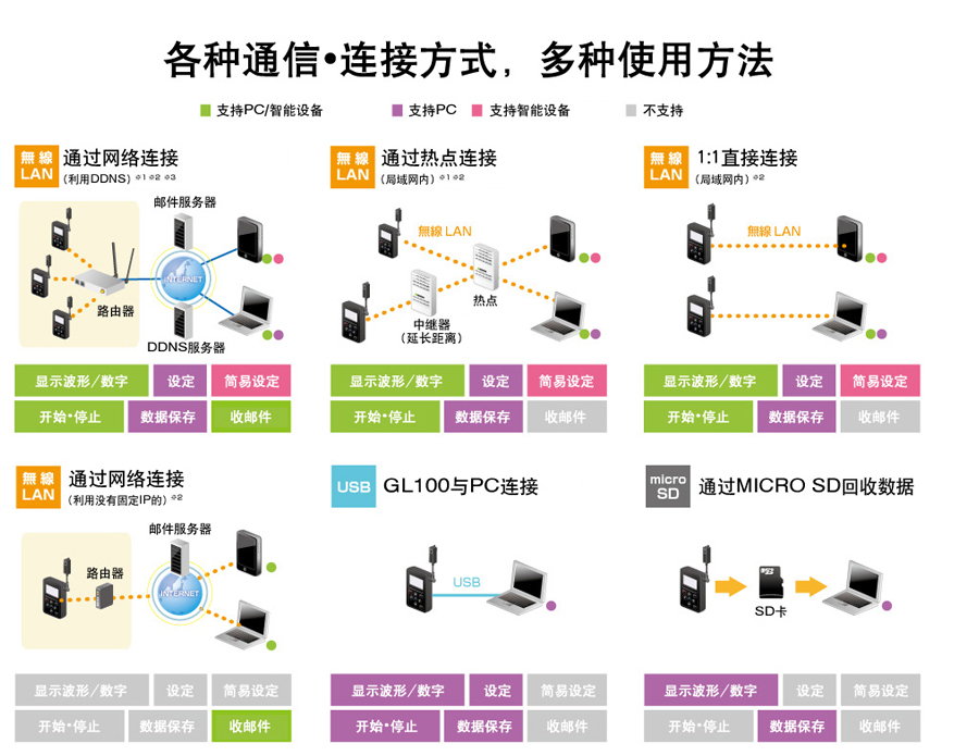 日本圖技GL100多功能便攜式數(shù)據(jù)記錄儀通訊功能: GL100-N標(biāo)準(zhǔn)型數(shù)據(jù)采集器可以通過USB接口和電腦通訊,通過電腦來讀取日本圖技GL100多功能便攜式數(shù)據(jù)記錄儀的數(shù)據(jù),同時(shí)還可以控制GL100-N開始或者停止記錄,更改測(cè)試條件等。GL100-N免費(fèi)提供專用分析軟件。日本圖技GL100多功能便攜式數(shù)據(jù)記錄儀無線版可以通過WIFI信號(hào)和電腦或者GL240/GL840實(shí)現(xiàn)無線通訊,電腦或者GL240/GL840記錄儀可以遠(yuǎn)程讀取日本圖技GL100-wl中的數(shù)據(jù)。通過電腦還可以遠(yuǎn)程對(duì)日本圖技GL100-wl進(jìn)行操作。