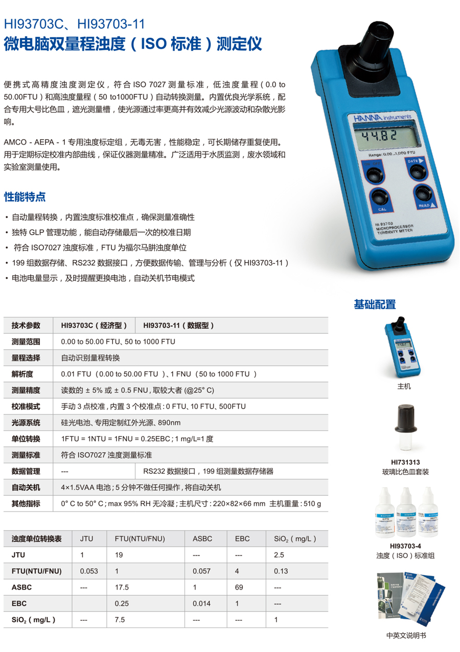 主機(jī),HI93703-4 定制專用濁度(ISO)標(biāo)準(zhǔn)組(標(biāo)值@25°C:0、10、500 FTU,規(guī)格:30mL×3 ),HI731313 專用玻璃比色皿套裝(2 個(gè)),中英文使用說明書,HI710139 定制專用儀器攜帶箱【溫馨提示:為確保濁度校準(zhǔn)液不被污染,保障校準(zhǔn)液可行性和準(zhǔn)確性,建議用戶在訂購儀器時(shí),同時(shí)訂購HI731313專用玻璃比色皿,用于分裝濁度標(biāo)準(zhǔn)液;建議用戶訂購HI93703-50比色皿清潔液、HI93703-58玻璃比色皿修復(fù)液和HI731318玻璃比色皿清潔布,用于玻璃比色皿清潔修復(fù),確保測量精度和讀數(shù)準(zhǔn)確度】