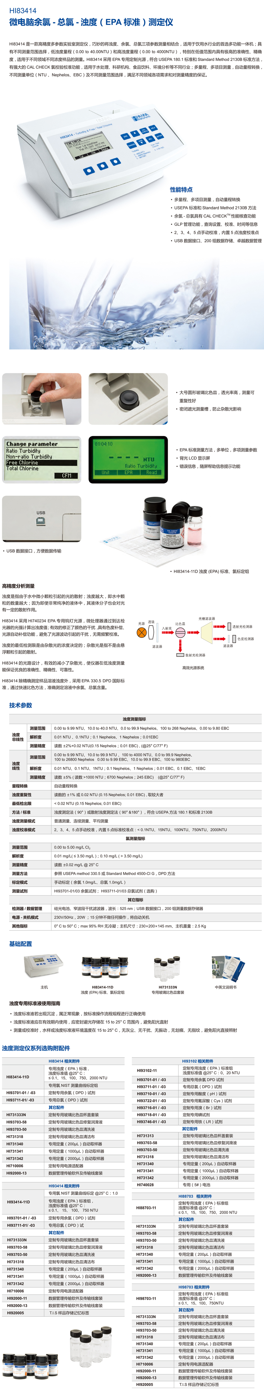 主機(jī),HI83414-11 專(zhuān)用濁度(EPA)標(biāo)準(zhǔn)、氯標(biāo)定組(濁度標(biāo)值@25°C:≤ 0.1、15、100、750、2000 NTU,專(zhuān)用氯NIST測(cè)量曲線標(biāo)定@25°C:1.0),HI731333N 專(zhuān)用玻璃比色皿套裝,HI93703-58 玻璃比色杯潤(rùn)滑劑,中英文使用說(shuō)明書(shū)【溫馨提示:建議訂購(gòu)HI93703-50比色皿清潔液和HI731318玻璃比色皿清潔布,用于玻璃比色皿清潔修復(fù),確保測(cè)量精度和讀數(shù)準(zhǔn)確度】