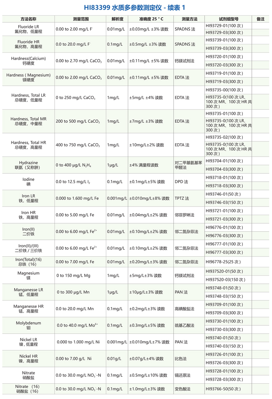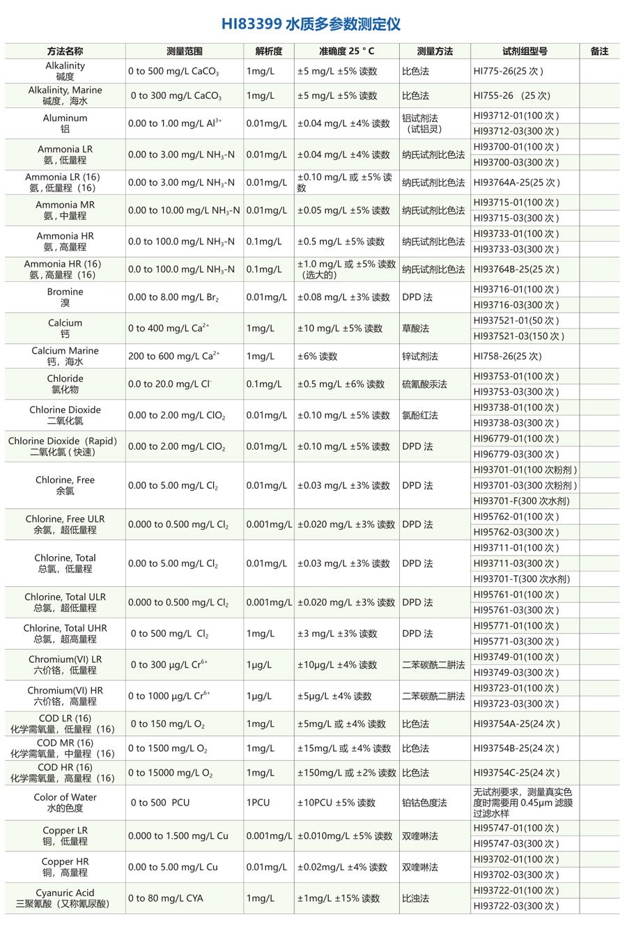 溴Br、碘、磷P、銅Cu、鐵Fe、鈣Ca、鎂Mg、錳Mn、鋁AI、鎳Ni、鉬Mo、鉀K、銀Ag、鋅Zn、堿度、余氯【游離氯】、總氯、氨氮、總氮N、總磷P、聯(lián)氨N2H4、臭氧O3、酸度pH、氯化物、氰尿酸、氟化物、總硬度、鈣硬度、鎂硬度、溶解氧O2、除氧劑、六價(jià)鉻Cr、磷酸鹽、硫酸鹽、硝酸鹽【氮】 、二氧化氯、二氧化硅、鉑鈷色度、亞硝酸鹽【氮】 、化學(xué)需氧量COD、陰離子表面活性劑SDBS、吸光度【Abs】等水質(zhì)指標(biāo)快速精確測量。