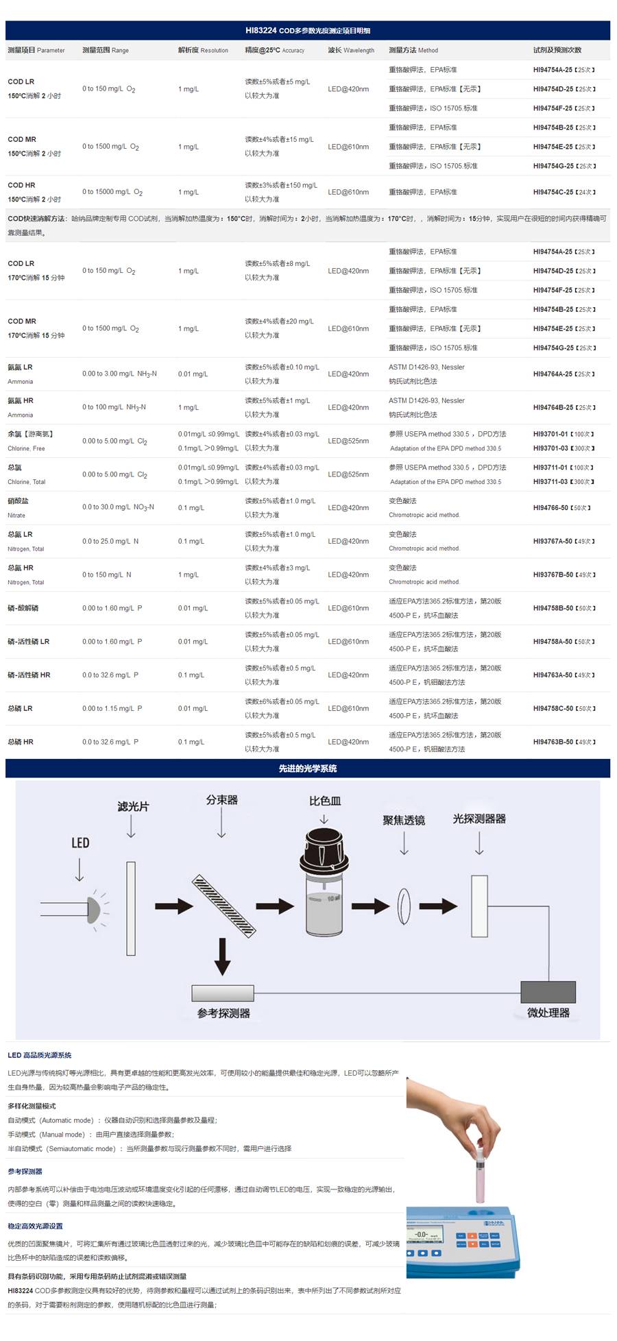 產(chǎn)品描述:高性能COD多參數(shù)測定儀,余氯【游離氯】、總氯、氨氮、化學(xué)需氧量 COD、總氮N、總磷P、磷酸鹽【酸解磷、活性磷】、硝酸鹽【氮】重要水質(zhì)指標精確快速測定,使用對應(yīng)的測量試劑,通過試劑上的條形碼,可自動識別測量項目中所需測量項目、參數(shù)及測量范圍,無需手動........