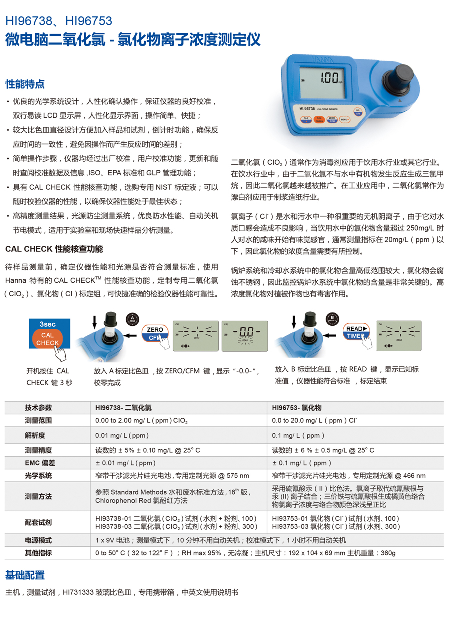 主機(jī),HI93738-01 專用二氧化氯試劑,HI96738-11 專用二氧化氯NIST測(cè)量曲線標(biāo)定組,HI731333 定制專用玻璃比色皿(2個(gè)),HI731318 專用玻璃比色皿清潔布(2塊),中英文使用說明書,HI721018 定制專用儀器攜帶箱【溫馨提示:為了方便快捷添加樣品,請(qǐng)選購HI740157P專用微量塑料吸管(20個(gè)/組),用于待測(cè)樣品的提取,也避免交叉污染】