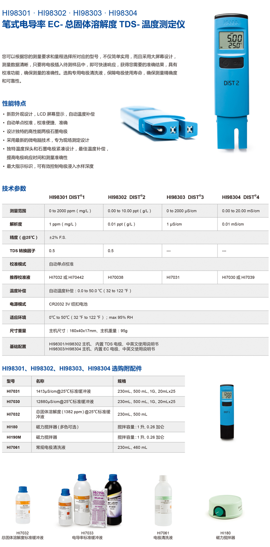 主機(jī),內(nèi)置電導(dǎo)率EC電極,HI70030 袋裝電導(dǎo)率標(biāo)準(zhǔn)緩沖液,規(guī)格:20mL,中英文使用說明書,HI721318 專用攜帶盒