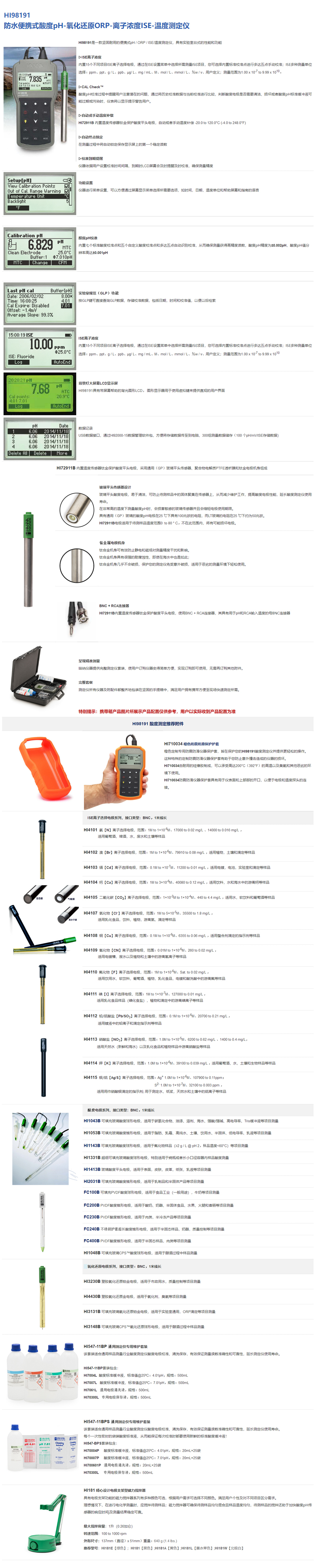 主機(jī),HI72911B 不銹鋼保護(hù)套的內(nèi)置溫度傳感器酸度復(fù)合電極,酸度標(biāo)準(zhǔn)緩沖液(標(biāo)準(zhǔn)值@25°C:4.01pH、7.01 pH ,規(guī)格:230mL×2,常規(guī)電極清洗液,規(guī)格:20mL×2),專用塑料燒杯,規(guī)格:100mL×2、HI920015專用USB數(shù)據(jù)線、HI92000專用軟件,中英文使用說明書,HI721191 定制專用儀器攜帶箱【溫馨提示,為了測(cè)量便利或保障測(cè)量數(shù)據(jù)穩(wěn)定性,建議選購HI181具有電極支架型磁力攪拌器或者HI190M 磁力攪拌器】
