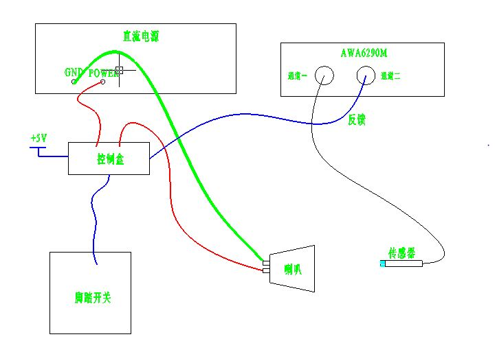 踩下腳踏開關后,電源控制盒接通直流穩(wěn)壓電源與喇叭之間的通路,并保持;再次踩下腳踏開關,斷開電路。